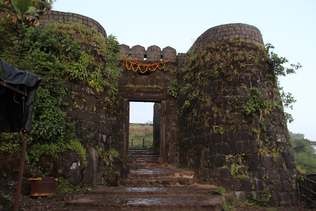 ही एक गोष्ट आणि दुसरी म्हणजे सहसा लोक म्हणतात की मुंबई रात्रीसुद्धा झोपत नाही पण तिकडे गेल्यावर एक गोष्ट लक्षात आली की "अहो मुंबई सोडा पुणे पण रात्री झोपत नाही" कारण आम्ही जेव्हा ५ वाजता चढायला सुरुवात केली तेव्हा काही जण सिंहगड उतरत होती तेव्हा तर मी विचारच करत बसलो की हे सगळे वरती रहायलाच जातात का??? ह्या सगळ्या गोष्टींचा विचार करत आम्ही पुणे दरवाज्यापाशी पोहोचलो लखलखत्या प्रकाशात झळाळणाऱ्या पुणे दरवाज्याचा योगायोगाने का ना होईना पण मी साक्षीदार झालो. नुकतंच उजाडल्याने दरवाज्यापाशी गर्दी झालेली म्हणून आधी बाहेरच्या बाजूने सिंहगड न्याहाळला मग पुणे दरवाज्यातून आतील बाजूस प्रवेश करून चहूबाजूने फेरफटका मारला ढगाळ वातावरण असल्याने मोजकेच फोटो काढता आले तरी सकाळचे किमान दोन तास सिंहगडावर व्यतीत करून पुन्हा परतीच्या वाटेने निघालो. साडेआठची बस पकडून पुन्हा गिरीष सरांच्या घरी पोहोचलो.